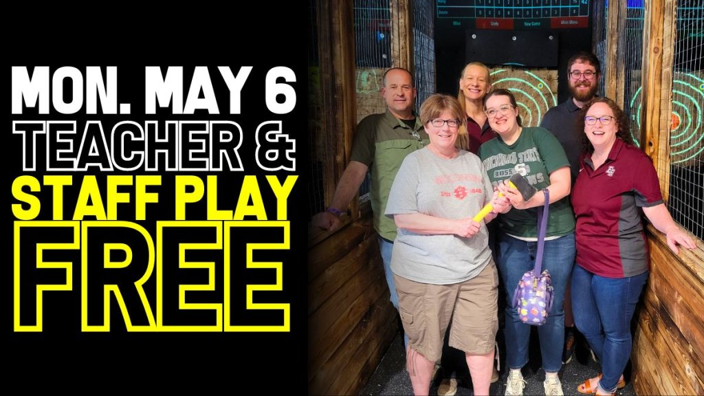 The All Access Day Pass, usually $75, will be completely free for teachers and staff, including unlimited Axe Throwing, Throwbowling, up to three Go-Kart Races, GellyBall Blaster Battles, Archery Tag, access to Rage Room, & Pocket Soccer. Food and beverages will not be provided, but High Caliber does offer a great new menu filled with pizza, sandwiches, & appetizers along with two full bars with local Michigan breweries on tap and plenty of spirits.