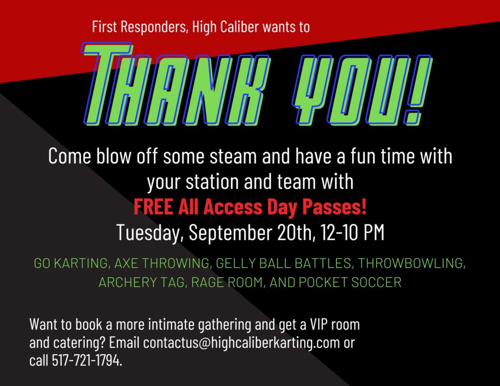 September 07, 2022, East Lansing, MI – High Caliber Karting & Entertainment wants to give back to the First Responders who keep the community safe in the Greater Lansing Area on Tuesday, September 20, 2022, by offering a free day of activities and fun at the entertainment facility. All individual emergency personnel are invited to come out and receive a free All Access Day Pass for themselves to blow off some steam and destress from a long summer season.